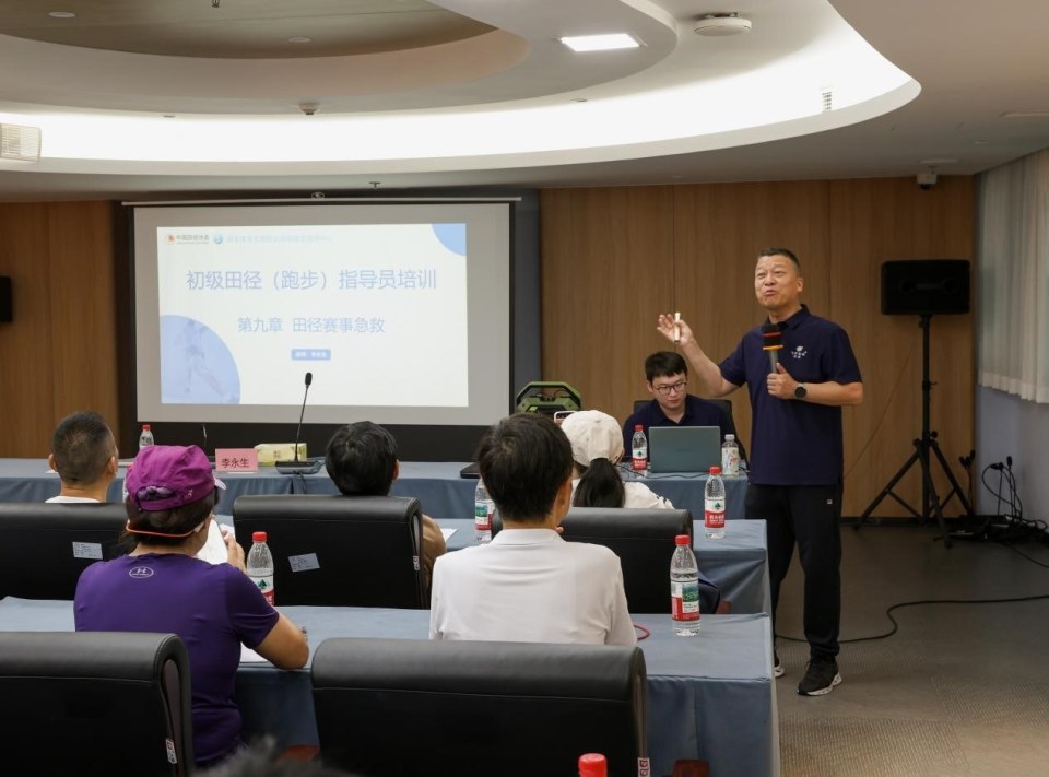 培训中的室内理论教学聚焦实用知识,特邀田径运动资深急救讲师李永生授课。课程内容紧密贴合社区指导需求,包括跑步技术原理、不同人群训练计划制定等内容,同时针对常见运动伤害场景,重点讲解了群众体育赛事组织基础与跑步安全风险防控知识。系统阐述跑步中扭伤、抽筋、中暑、心脏骤停等突发状况的应急处理流程,课程特别设计“运动指导+急救保障”的相关知识。
